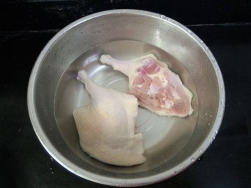 4. 鸭腿用清水浸泡30分钟,去掉些血水。
