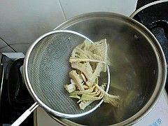 3. 锅中水烧开放入百叶和牛肚焯烫一下备用。