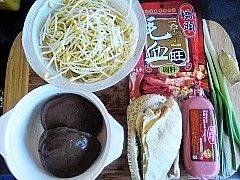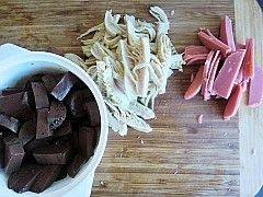 2. 鸭血洗净切块,牛百叶和牛肚切条,火腿切片。