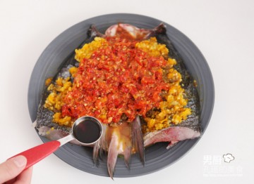 3. 鱼头翻面,取适量黄灯笼酱和剁椒酱铺在鱼头上。