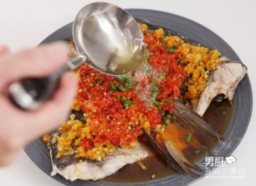 7. 最后撒上蒜蓉、葱花,锅中烧热油,淋在鱼头上即可。