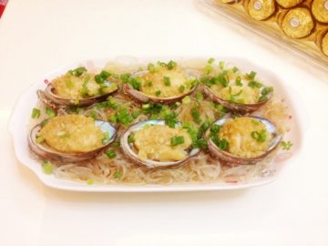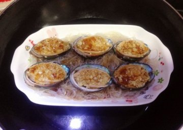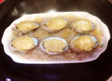 10. 将鲍鱼摆在粉丝上,在鲍鱼和粉丝上淋上酱汁。