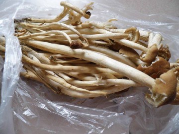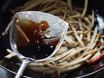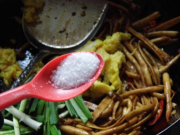 7. 炒香后放茶树菇,煸炒,要有耐心,不用翻动得太勤,炒到水分全干,有点焦黄的样子