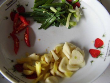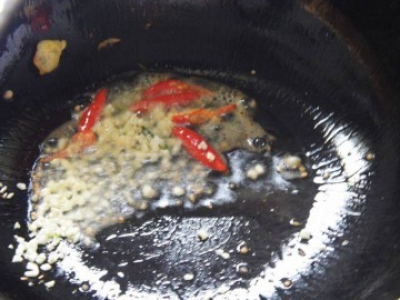 6. 锅里留底油,油热下入姜蒜末和尖椒段炒香