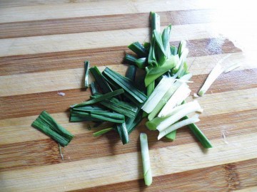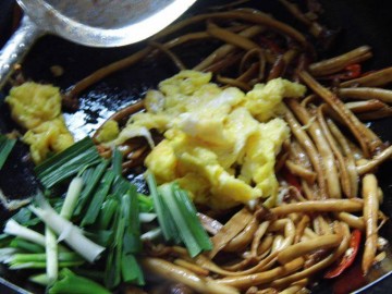 9. 接着放入炒好的鸡蛋和蒜苗翻炒