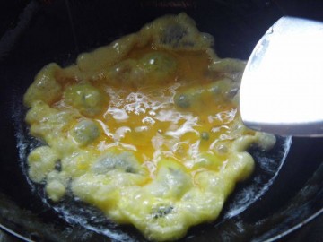 5. 净锅上火放油烧热,倒入鸡蛋液,这时鸡蛋立即起泡,快速翻面划散,盛出备用