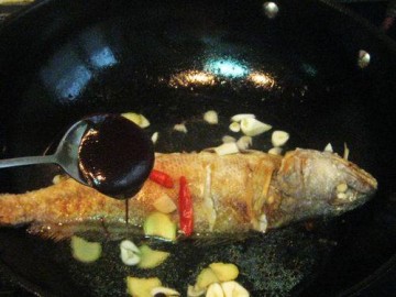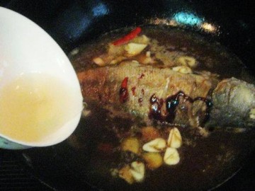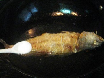 3. 在鱼两面横划3刀,撒些盐,料酒,腌10分钟,拍上淀粉