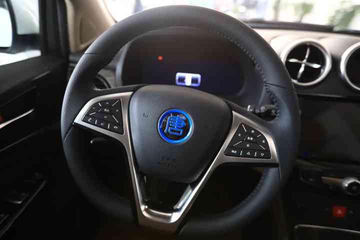 方向盘手握处有打孔设计手感不错,白黑的颜色搭配时尚年轻化,方向盘中间的“唐”字logo以蓝色呈现增色不少。多功能的按键分布在方向盘两边可实现多种智能操作,驾车体验更为方便。