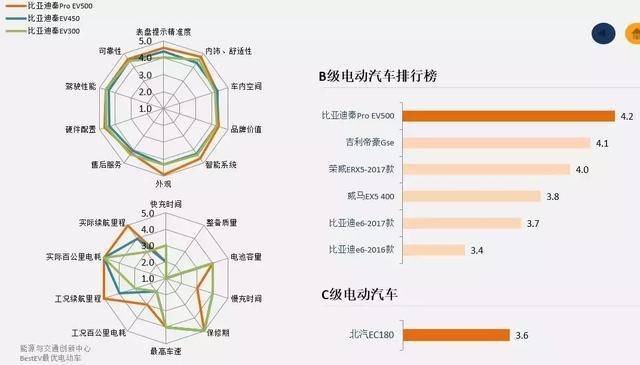 B级电动汽车中,比亚迪秦Pro EV500以4.2分的综合评分获得第一名,这款车也是所有车型中,外观、内饰、舒适度、硬件配置等指标,得分最高的车型。