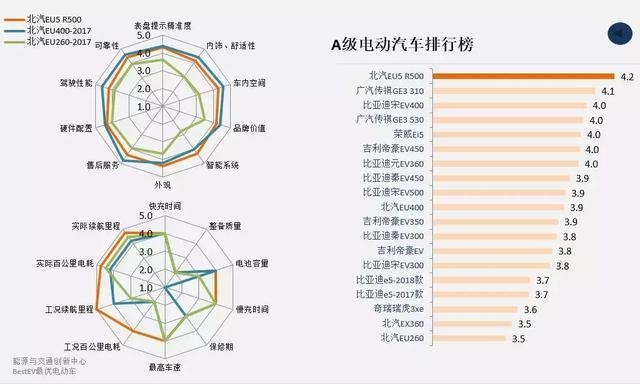 A级电动车中,北汽新能源EU5 R500得到4.2分的成绩,位列第一,紧随其后的是广汽新能源GE3 310。参与调研的用户对前者的评价是“续航准”,后者则是“可靠性高、故障率低”。