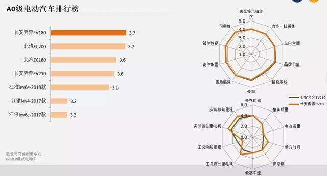 A0级电动车中,奔奔EV180以3.7分(满分为5分)的成绩,获得第一名。奔奔EV被调研用户称作“高性价比占号车”,还有用户将这款续航里程210公里的车,开出281公里续航的成绩。