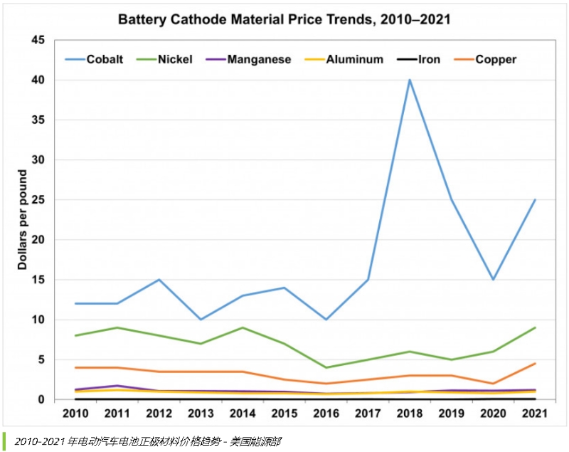 2010-2021 年电动汽车电池正极材料价格趋势 - 美国能源部