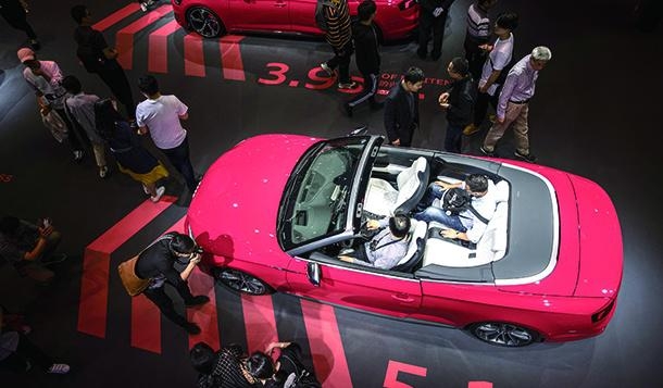 在第18届上海国际汽车工业展览会上,新能源汽车吸引观众了解体验