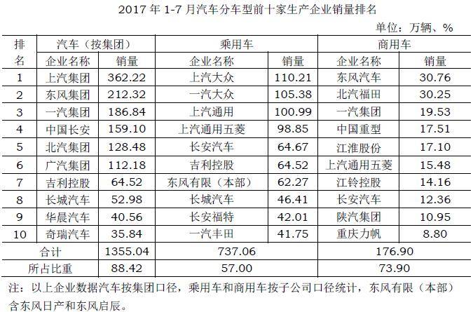 2017年1-7月汽车分车型前十家生产企业销量排名