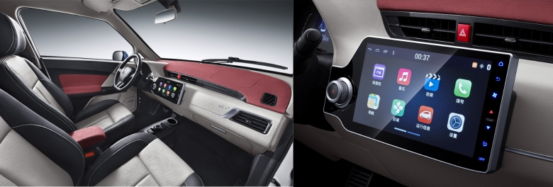 众泰E200最大功率60KW,最大扭矩165N.m,作为一款微型电动车,E200可以达到200KM的续航里程,E200的电池安置于车身头部。在内饰上众泰E200一眼望去显得十分大气,硬塑的内饰、三幅式方向盘设计当然还有不得不说的超大的液晶屏。众泰E200的液晶屏采用的是悬浮设计,搭载的安卓智能系统,可以实现手机互联、脸呀音乐、导航、空调甚至还可以存储照片在线浏览等功能。