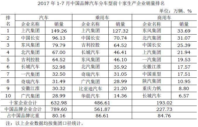 2017年1-7月中国品牌汽车分车型前十家生产企业销量排名