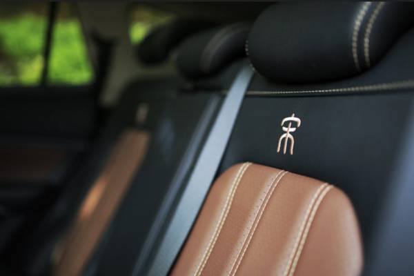 双色搭配的真皮打孔座椅相当厚实,靠特意绣上了“宋”字样,主副驾不仅带座椅加热,还有两档通风调节,后排还配了独立三个头枕,舒适到位。往上一看,是全景天窗,按一下开关打开天窗隔热板,整个车里顿时亮堂堂的。