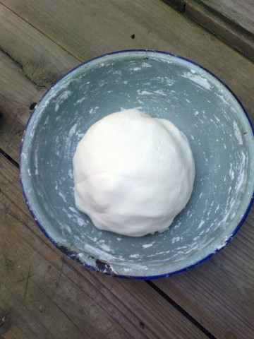 6. 糯米粉慢慢加开水搅拌成絮状待不烫手再和成面团