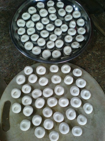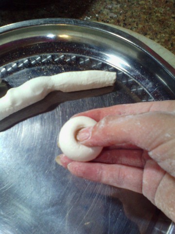 7. 揪一小块面搓成长条再分成汤圆大小的剂子搓圆再用大拇指往中间按下去成窝状