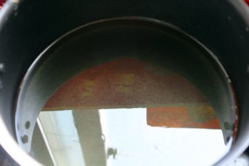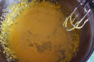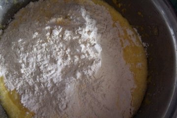 5. 低筋面粉、高筋面粉和泡打粉混合后,筛入第5步的液体混合物里。