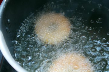 11. 把发酵好的甜甜圈面团放到油锅里,炸至两面金黄即可。当一面炸好以后,要及时翻面。 炸好的甜甜圈,沥干油以后,放在冷却架上冷却。(冷却架上垫一块可以吸油的布,效果更佳)。甜甜圈完全冷却以后,在表面刷点蜂蜜水,粘点椰蓉,彩针或者糖粉作为装饰。