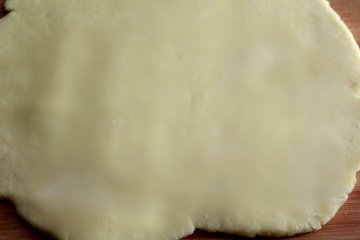 7. 把静置好的面团在案板上擀开成为1CM厚的面片,再静置松弛十五分钟。