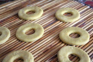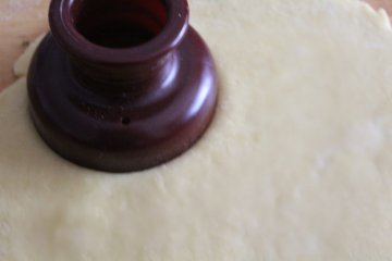 8. 用甜甜圈模具在面片上切割出甜甜圈的形状。