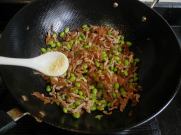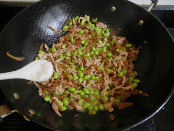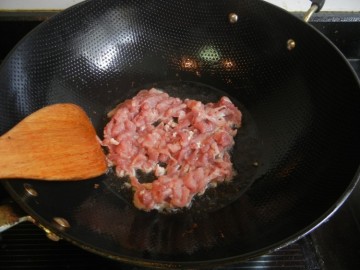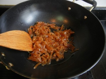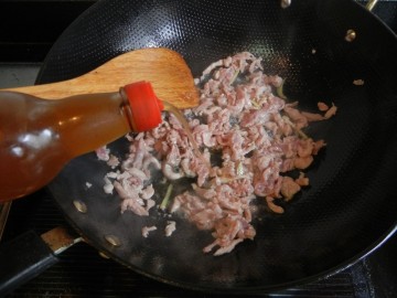 6. 锅里油热,下姜丝爆香,放入肉丝煸炒
