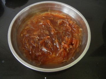 2. 包瓜去籽,洗净切丝,用清水浸泡一下去掉些咸味.捞出,沥干水分待用