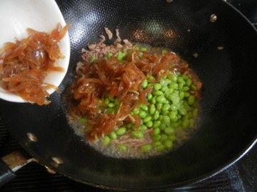 7. 当肉丝有些转色,加料酒煸炒,加点清水煮开