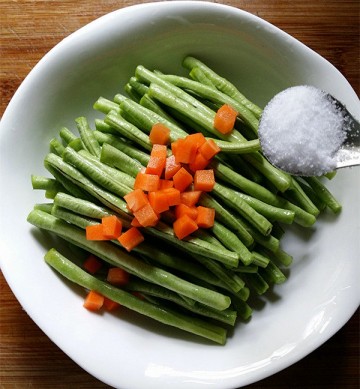 3. 胡萝卜粒一起放入大碗中,加2小勺食盐腌制半小时