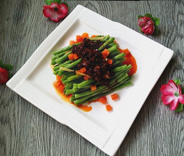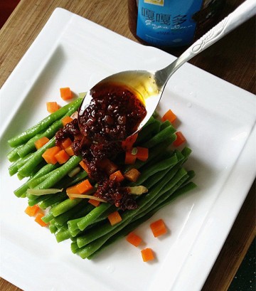10. 将嘎嘎多牦牛肉酱均匀淋在豇豆上