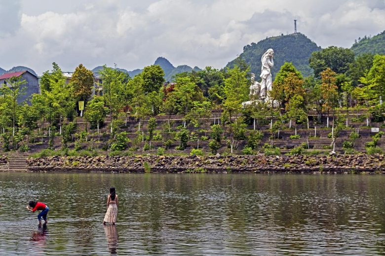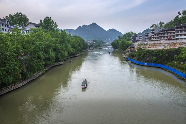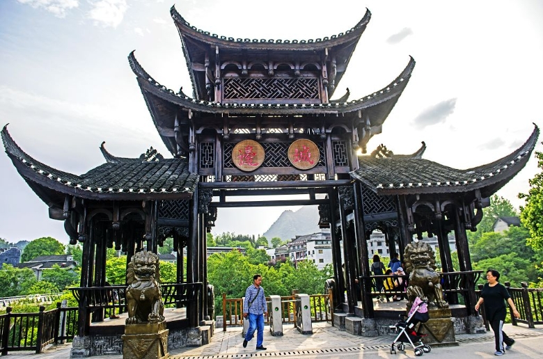 茶峒位于湘、黔、渝、三省(市)交界处,始建于嘉庆八年(1803 年),有“一脚踏三省”之称,属湘 西的四 大名镇之一。解放前,山城雄峙,城垣逶迤,河水悠悠。青石道整洁风雅, 吊脚楼古色古香,白塔耸立,古渡摆舟,如诗如画。诗云:“ 边城胜景令人醉,疑是身在画中游。”著名 文学家 沈从文以茶洞为背景,写出小说《边城》,驰名中外。