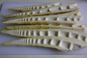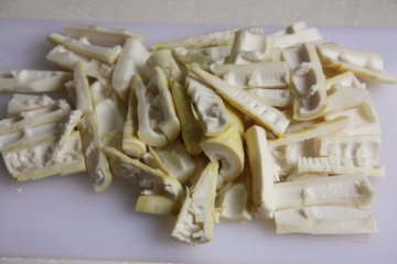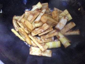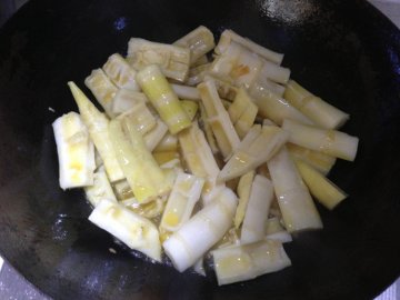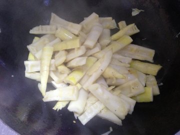 8. 将春笋倒入热油中,待春笋水分基本收干后盛出。