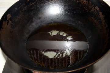 7. 炒锅置中火,倒入菜油,烧至七成热。