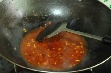5. 油锅烧至五成热,放入红烧排骨酱和豆豉,煸炒出香味
