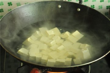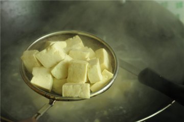 3. 烧开一锅水,将豆腐丁倒进去汆烫