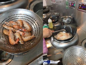 3. 虾焯水变色即可,沥干水份。撒上生粉炸一会。