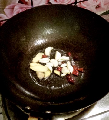4. 热锅冷油,放入姜片蒜片辣椒段爆香