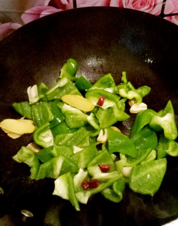 5. 倒入甜椒,炒至变色