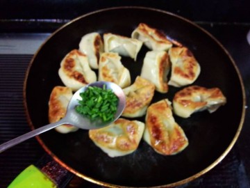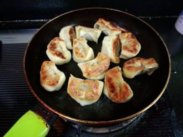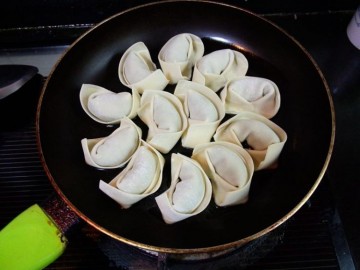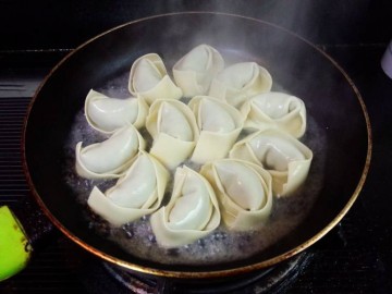 9. 取平底锅,冷锅下油,放入馄饨,开火,煎至底部有些黄,