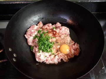 4. 猪肉糜放入炒锅,加一小勺清水,往一个方向搅拌上劲,