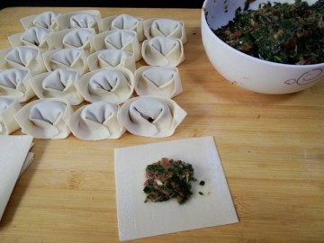 8. 取一张馄饨皮子,放入适量马兰头肉馅,包成馄饨,