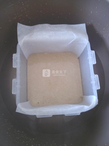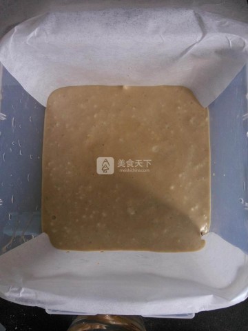 6. 找一个耐热的保鲜盒,垫上一层油纸,倒进去核桃西米层