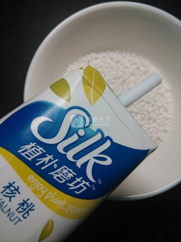 2. 然后倒进去大半盒核桃原汁,浸泡过夜