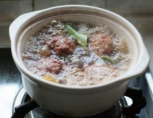 4. 砂锅里放高汤、葱、姜、盐、料酒、酱油、丸子,大火烧沸,小火炖30分钟