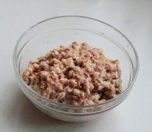2. 肉丁、荸荠碎、鸡蛋、淀粉、盐、料酒、香油拌匀