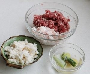 1. 猪肉切成绿豆大小的丁,荸荠拍碎,葱姜拍松泡成葱姜水