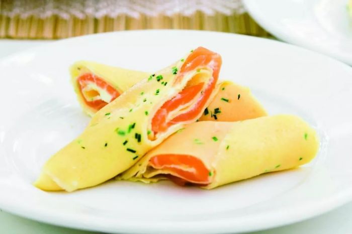 上菜时,分开两条鱼肉,分别切成薄片,用扇形的方式摆盘,再配上柠檬汁和莳萝汁水。这是一道烟熏冷盘,很适合配沙拉食用。