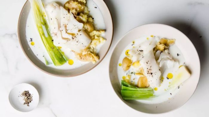 将土豆、西蓝花和鳕鱼盛入碗中。在每个上面舀一些汤汁。可放少许辣椒调味。在牛奶中舀取鳕鱼,是一种乐趣。这道健康菜肴也可以作为一顿正餐。